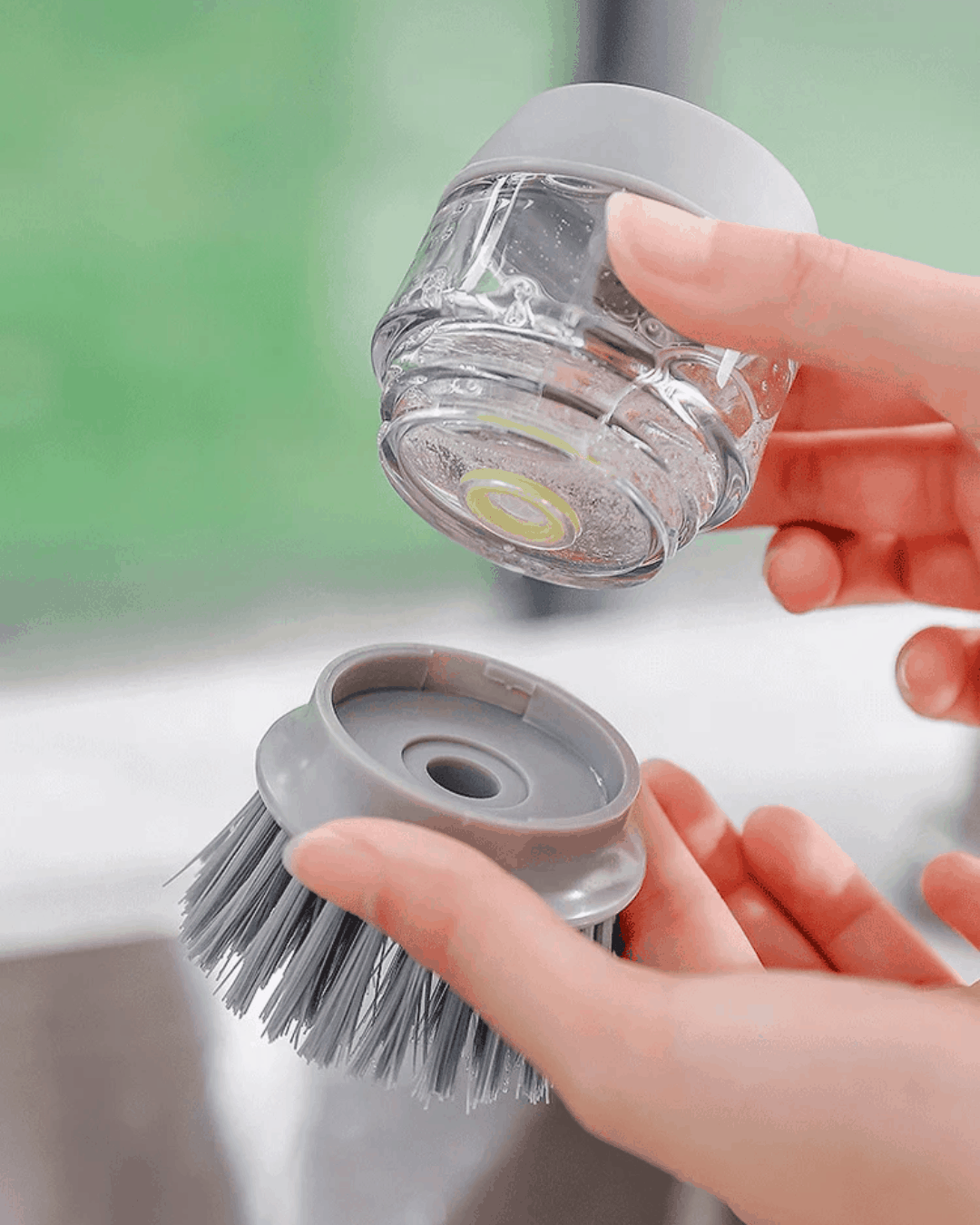 El Cepillo con Dispensador de Jabón tiene un tanque transparente que llenás una vez y después solo apretás para que salga la cantidad justa. Olvidate de abrir y cerrar el detergente con las manos mojadas.